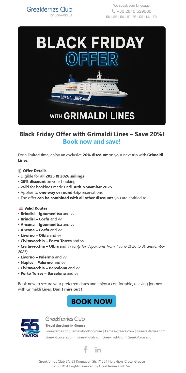 Black Friday Offer with Grimaldi Lines – Save 20%!