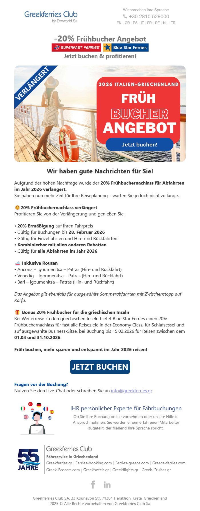 -20% Frühbucherangebot 2026 - Superfast Ferries - Blue Star Ferries