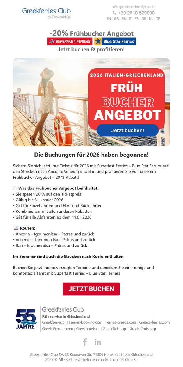 -20% Frühbucherangebot 2026 - Superfast Ferries - Blue Star Ferries