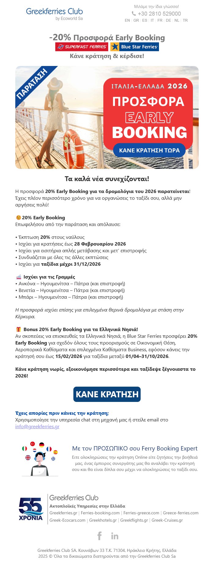 Παράταση: Η Προσφορά Early Booking -20% ισχύει πλέον έως 28/02/2026