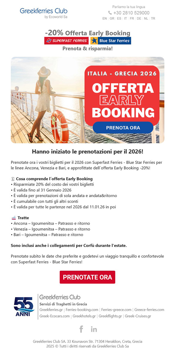 -20% Prenotazione Early Booking 2026 - Superfast Ferries - Blue Star Ferries