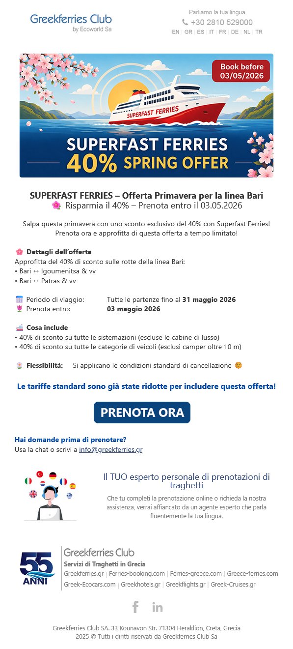Offerta Primavera 40% con Superfast Ferries – Tempo limitato!